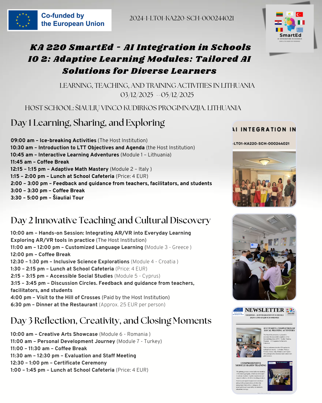 As part of the Erasmus+ School Education project “SmartEd – AI Integration in Schools”, participants will take part in inspiring activities hosted by Šiaulių Vinco Kudirkos Progimnazija from December 3–5, 2025.