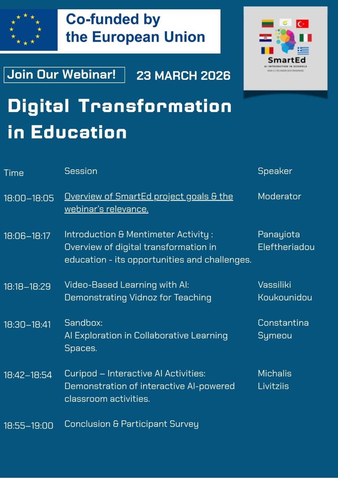 The SmartEd project invites educators to join the third international webinar, dedicated to exploring digital transformation in education and the practical use of AI tools in the classroom.